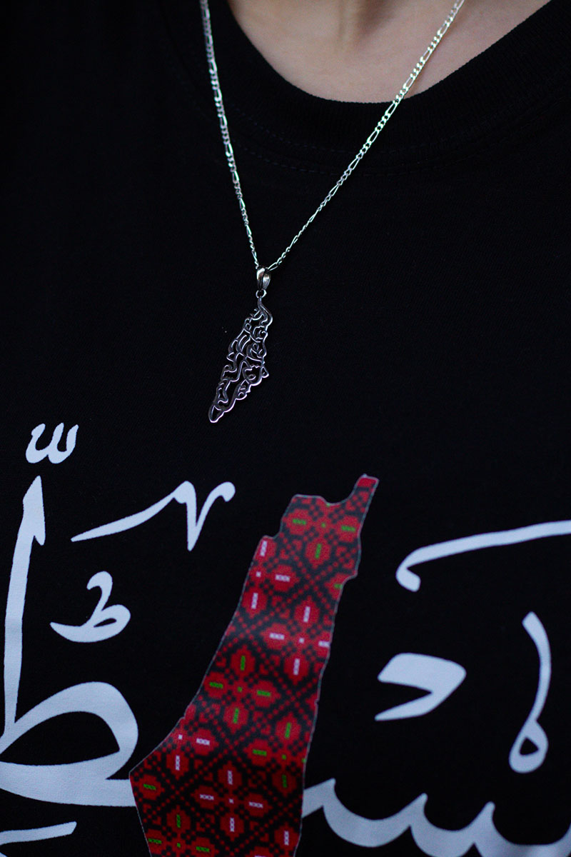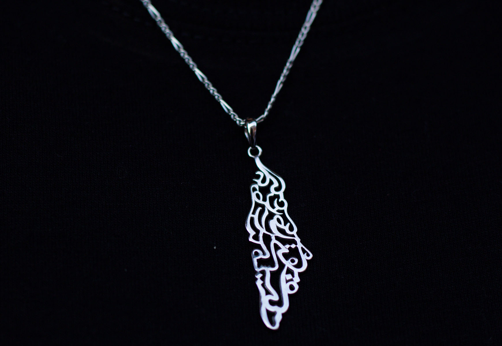 Silver-tone necklace featuring a Palestinian map pendant in elegant Arabic calligraphy, a meaningful symbol of heritage and identity.